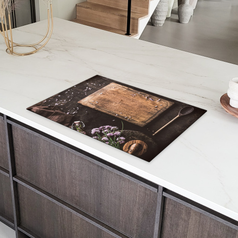 Inductiebeschermer - Snijplank - Kruiden - Lepel - Keuken - Rustiek - Vijzel - Bieslook